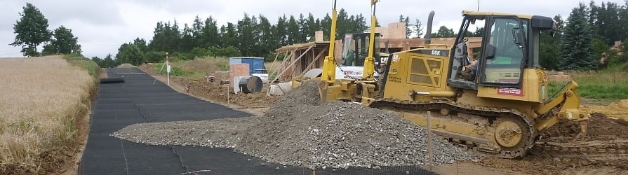 In Kombination mit Gesteinskörnung können dann Zufahrtswege oder Arbeitsplattformen gebaut werden, auch für sehr schwere Maschinen. Zunächst wird beim Zugänglichmachen der Baustelle das Geogitter ausgerollt, und zwar manuell. Glücklicherweise werden die Rollen starrer Geogitter in solchen Abmessungen hergestellt, dass sie von ein bis zwei Arbeitern getragen werden können, sodass sie sich auch in schwierigem Gelände bewegen können.